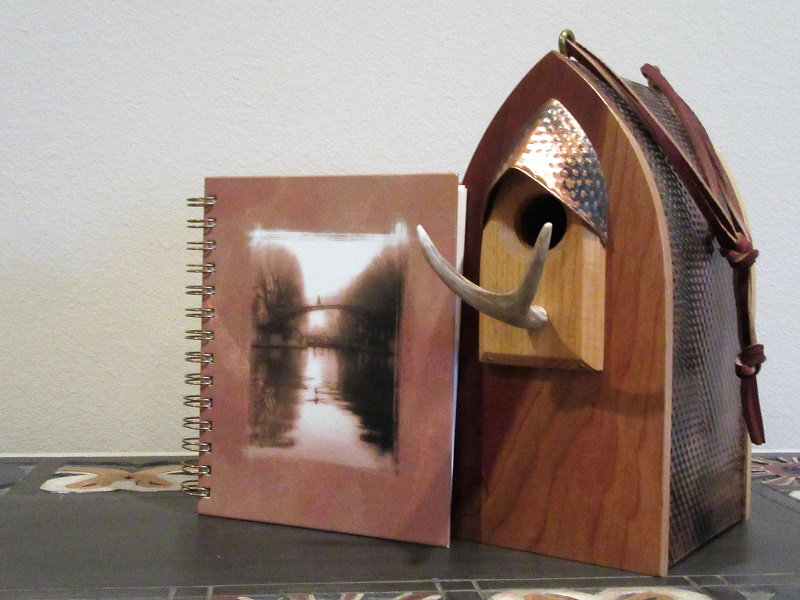 About 15 years ago, I left my position at the University of Iowa to work somewhere else. The spiral notebook with a picture of someone crossing a bridge and the fine birdhouse in the picture above were going away gifts.