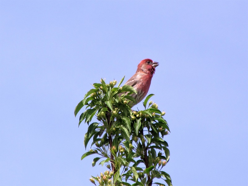 The eggs are white although I’ve read that house finch eggs are usually bluish. The other curiosity is the single chipping sparrow that hangs around and chirps up a storm whenever I get too close to the nest.