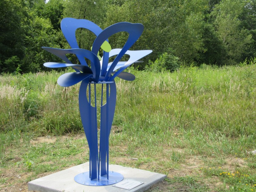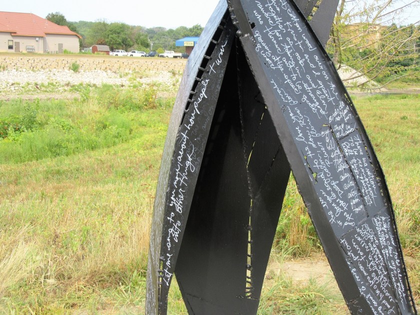 We had already visited the 5th sculpture last week. It is called Bloom by Hilde DeBruyn. Again, the theme of change because it’s a flower and flowers start from seeds in the earth, and burst up to the sun. Because this is where it all begins. DeBruyn is another gifted Iowa artist who has said in an interview with Iowa Artisans Gallery that her work often involves the “natural cycle of growth and decay.”