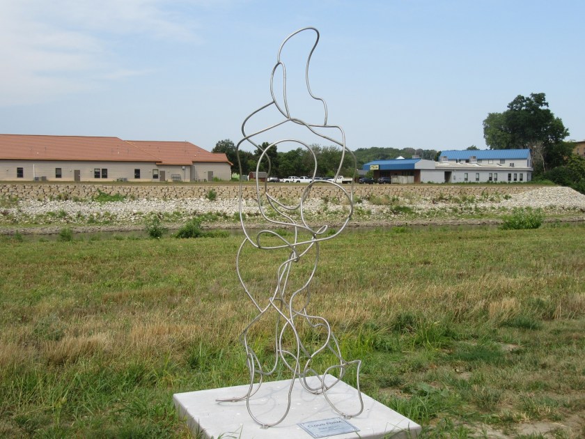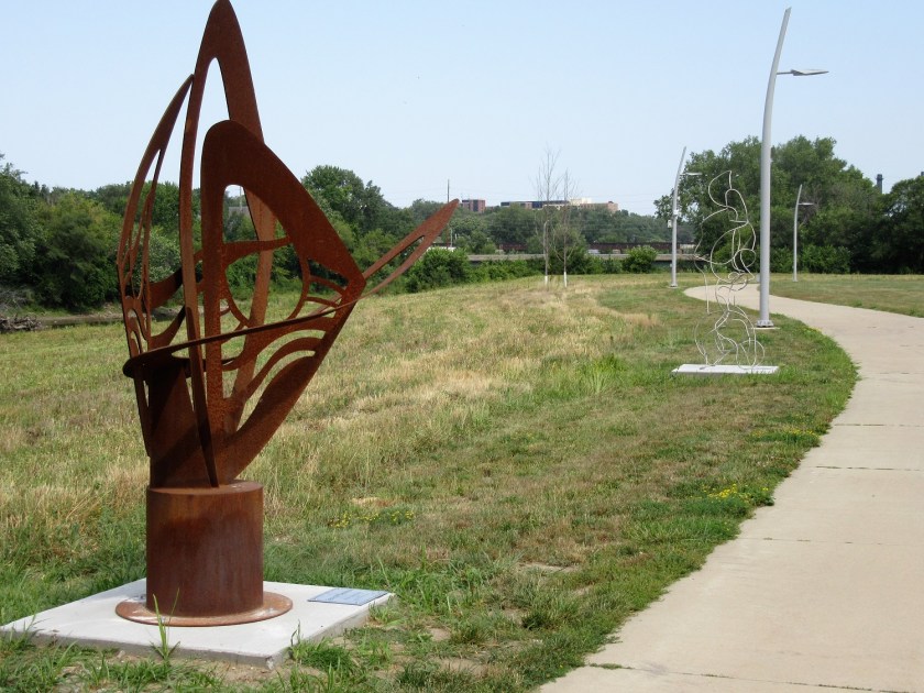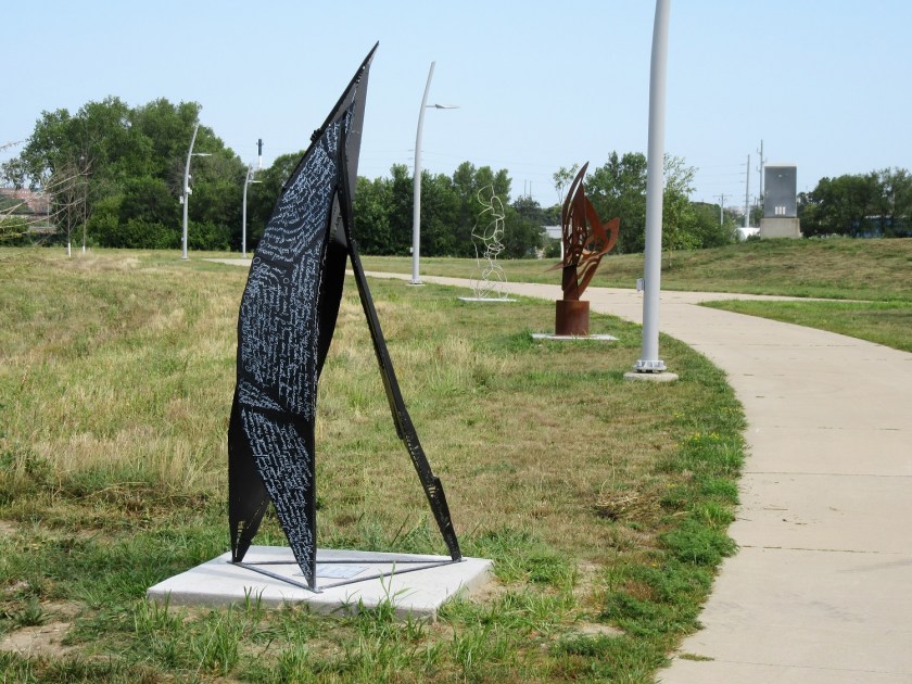 Since the weather took a break yesterday from the triple digit temperatures, we took a little getaway to a few of the city parks to see the new public art. This is connected with the Iowa City Public Art Program. Five sculptures were installed about a week ago at Terry Trueblood Recreation Area, Riverfront Crossings Park, and Mercer Park.