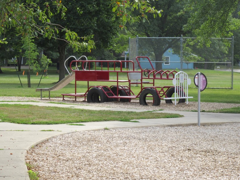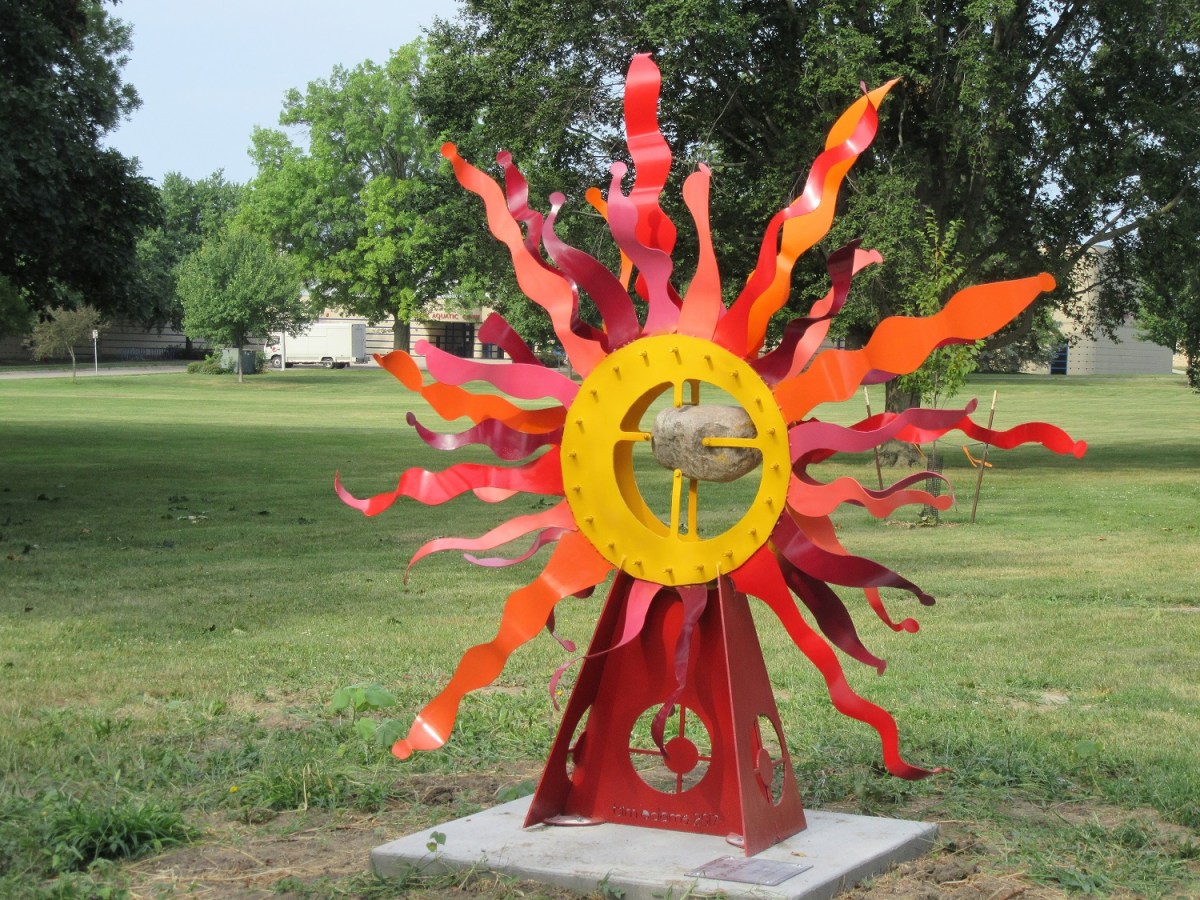 We also enjoyed Mercer Park where we saw the sculpture The Other Extreme, by Tim Adams. Mercer Park and Aquatic Center is named in honor of Leroy S. Mercer who distinguished himself as Iowa City Mayor, state representative and state senator as well as a successful businessman and banker. The sculpture is the sun with a rock at the center. According to Adams, it’s utterly simple; a clear vision of how everything started. There was only the earth and the sun. That was it. And then change took over. Things changing into other things. People turning into other things. Tim Adams art has been influenced by his career as a Registered Landscape Architect. His subjects are influenced by the rugged Iowa weather, which his creations are designed to withstand with little need for maintenance.