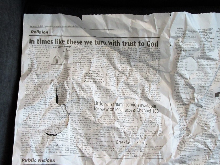 I haven’t read a regular newspaper in a long time. The Morrison County Record has a lot of the features I remember from several newspapers like the Des Moines Register and the Globe Gazette (Mason City). I noticed a large column in a section titled “Religion.” I can’t remember the last time I saw a newspaper column like that. The title of the column was “In times like these we turn with trust to God,” with the caption Inspirational Message with a small drawing of a church and the byline was Tim Sumner, evidently the pastor of River of Hope Ministries, Little Falls. So, this newspaper was published in a place called Little Falls in Minnesota.