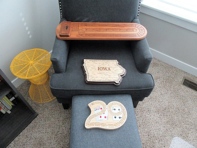 Anyway, the Iowa map cribbage board is smaller than our Jumbo board, but it’s a little bigger than the 29 board.