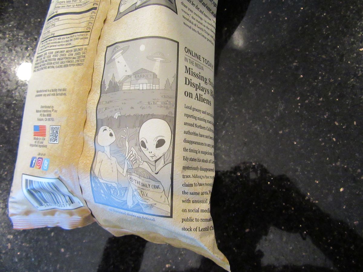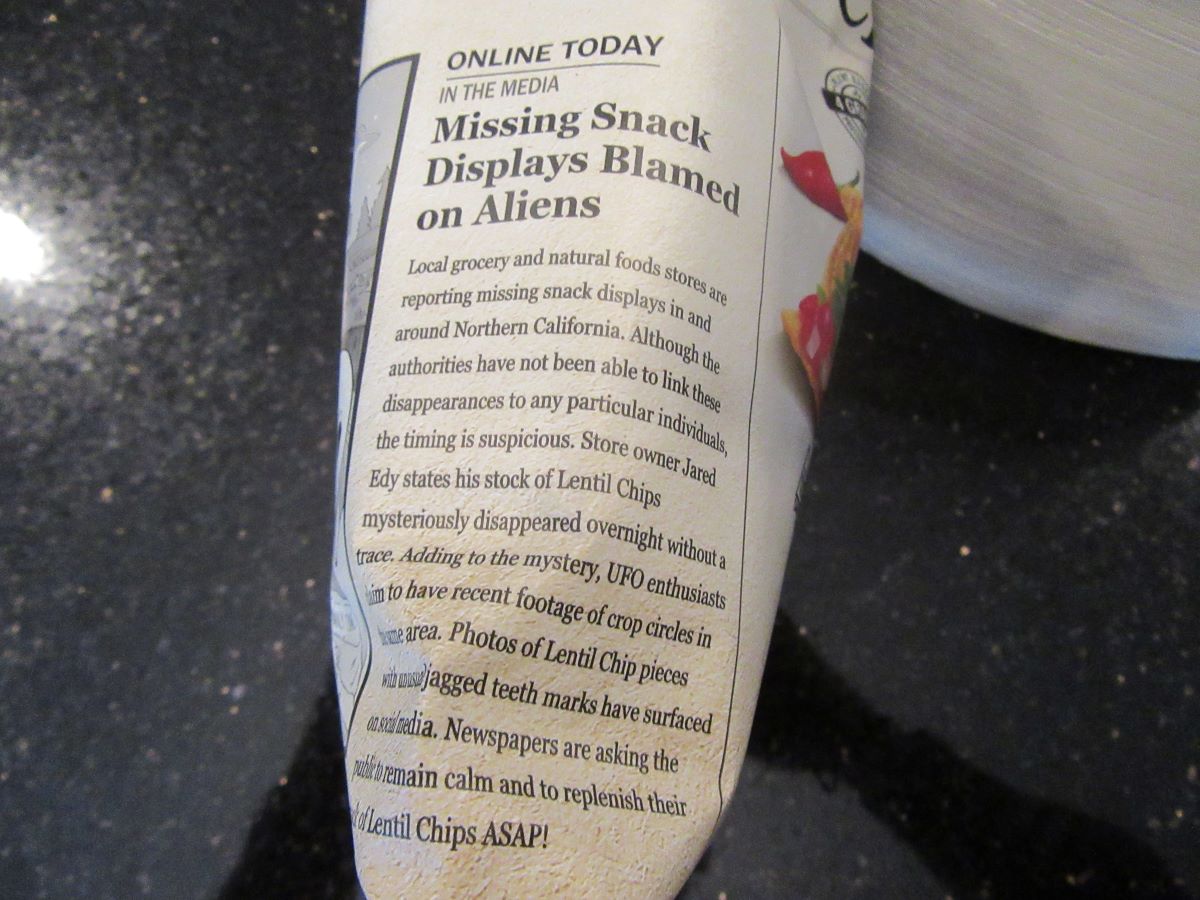 The Daily Crave news item (“Crop Circles coincide with missing new snack displays”) on the website differs from what’s on our bag, which has the headline “Missing Snack Displays Blamed on Aliens.”