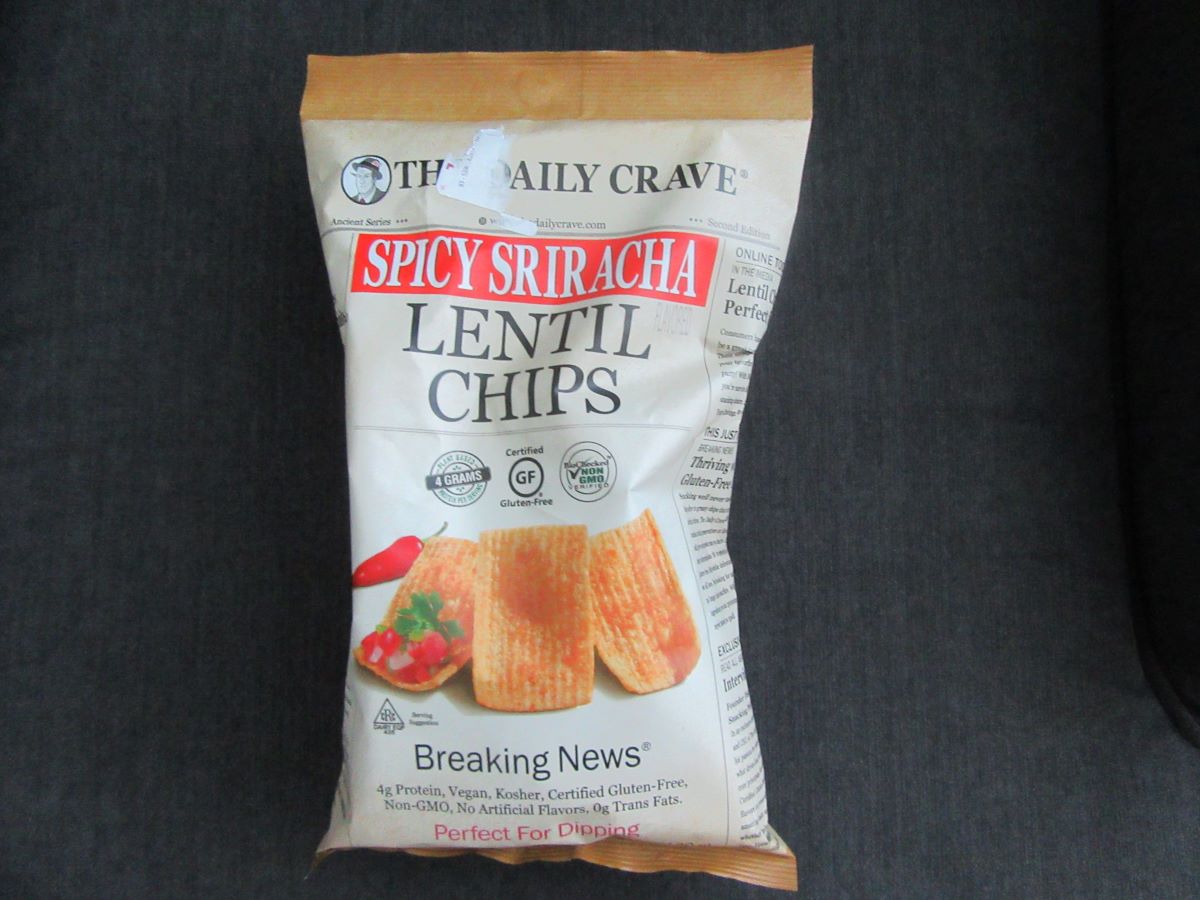 Sena bought a bag of Spicy Sriracha Lentil Chips yesterday. They’re at the center of an extraterrestrial news flash on the web site of the company, The Daily Crave, which sells a lot of healthier snack food items. They’re mainly plant-based.