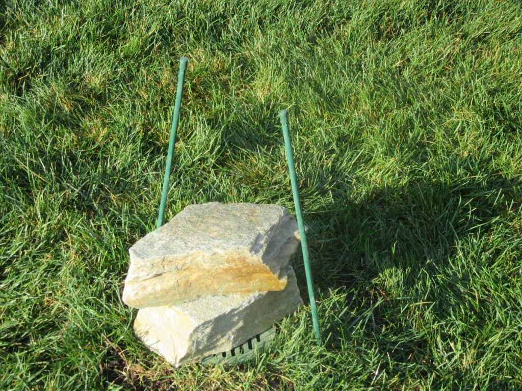 We can’t believe the 3-rock weight option to help secure the drain tile grate failed last night already. This morning, the top rock ended up about two feet away down the slope of our yard. The other two rocks were tipped over into the landscaping rod.