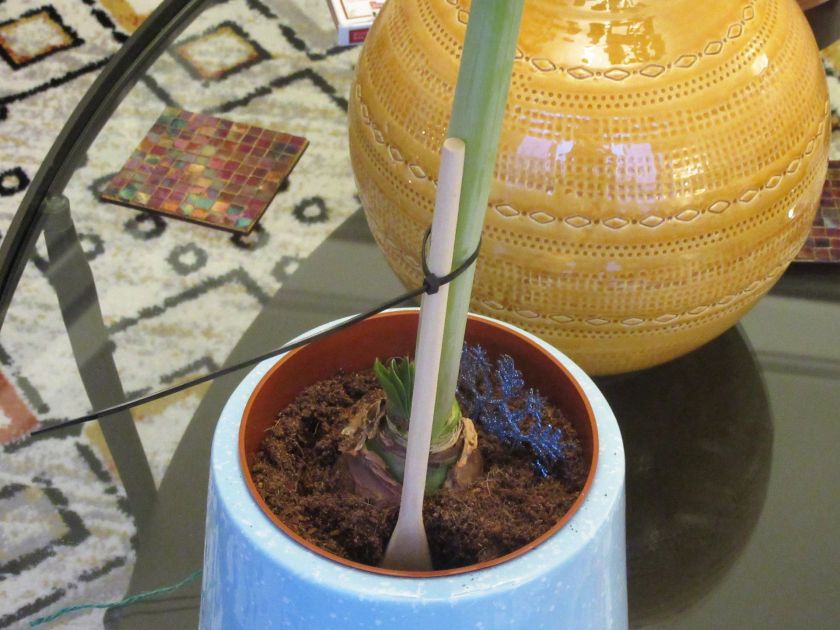 This morning we noticed that the Amaryllis was bent almost 90 degrees. We found a zip tie and used an old wooden spoon to stake it. Sure, it looks like amateurs did it-because amateurs did it. But the alternative is to cut the stem and sacrifice the blooms, which are still vibrant.