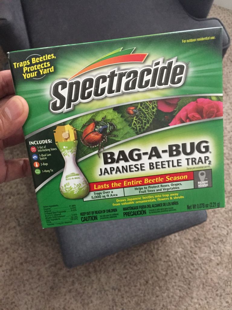 Sena has some Japanese Beetle traps she’s been thinking about using for some time now. She paid only a dollar a box because they were on sale. She’s hesitant. It’s Spectracide and uses a sex attractant and a floral lure to catch the little scarab beetles in a bag. In fact, the product is called Bag-A-Bug. The box advertises they are an “ideal method” to control Japanese Beetles and protect your yard. They cost about $8 or more a box, depending on where you buy them.