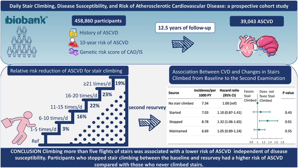 Climbing more than five flights of stairs (approx 50 steps) daily was associated with a lower risk of ASCVD types independent of disease susceptibility. Participants who stopped stair climbing between the baseline and resurvey had a higher risk of ASCVD compared with those who never climbed stairs.”