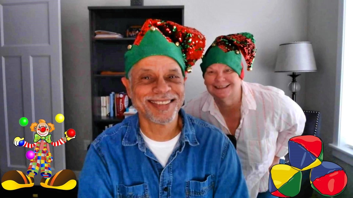 Announcing the upcoming not-to-be-missed, one of a kind, holiday extravaganza never before witnessed holiday extravaganza—Jim and Sena juggling in Santa Hats!