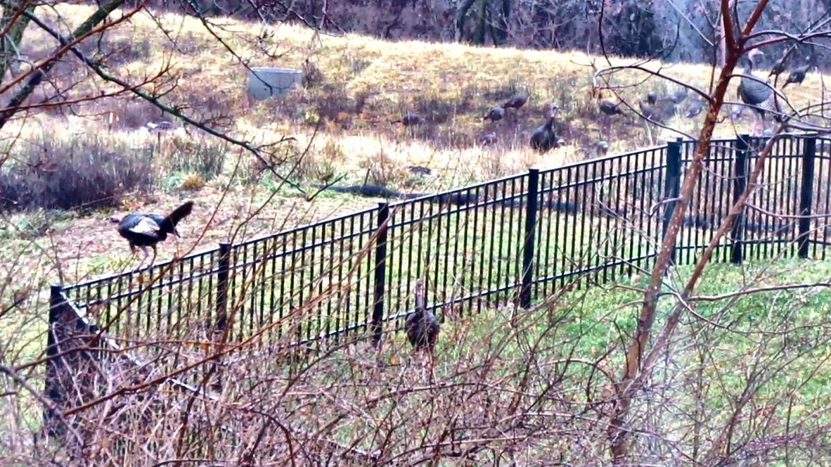 The wild turkeys are still doing the high jump over the fence. This time, I saw one of them jumping over the fence into the yard. So, they know how to get inside! But I couldn’t get a picture of it! I was washing the dishes at the time.