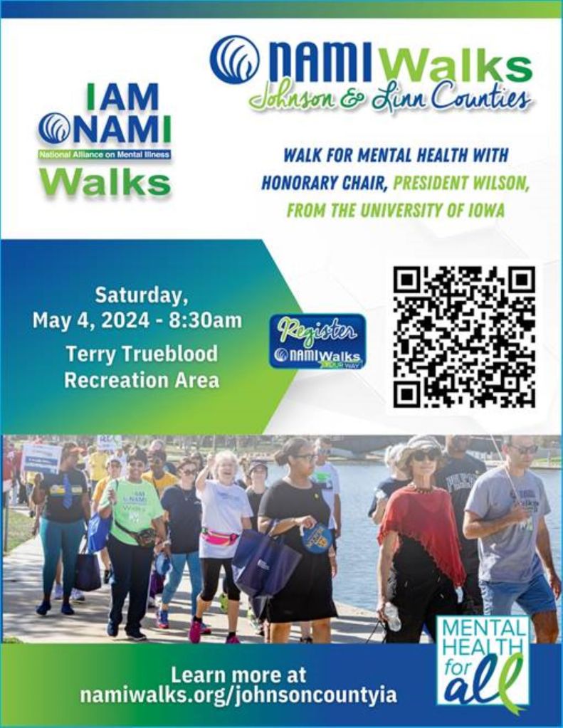 Reminder: NAMIWalks May 4, 2024 in Iowa City Don’t forget to register for the Johnson and Linn County NAMIWalks on May 4, 2024. See registration and location info below: Like Loading...