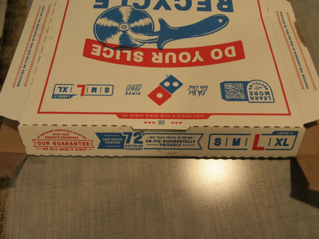 The pizza box is interesting and funny. One of the many messages on it reads: “Domino’s Carryout: It’s like a pizza-scented air freshener for your car except you don’t hang it from the mirror.” There are several messages on it indicating Domino’s sensitivity to protecting the environment. It’s almost like they’re trying too hard to be liked including one that says: