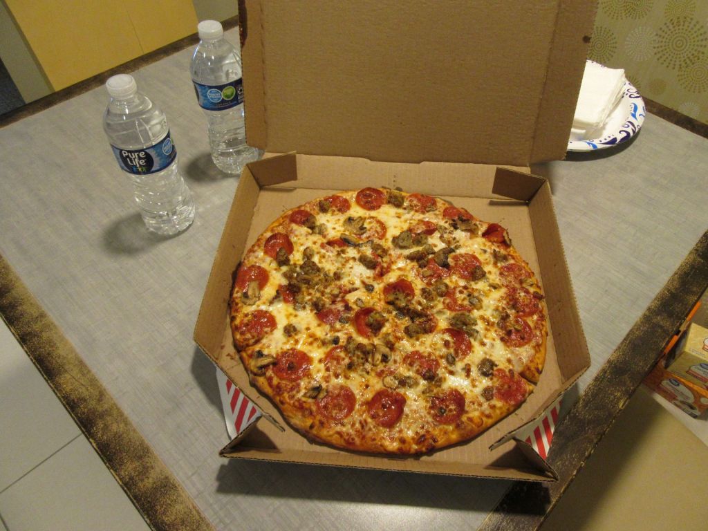 So, Sena got a Domino’s large takeout 3 topping with extra cheese (Italian sausage, pepperoni, and mushrooms). It was actually pretty good, though I thought it could have used more tomato sauce.