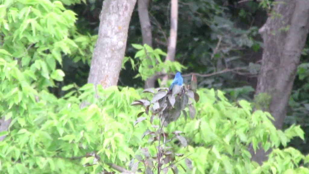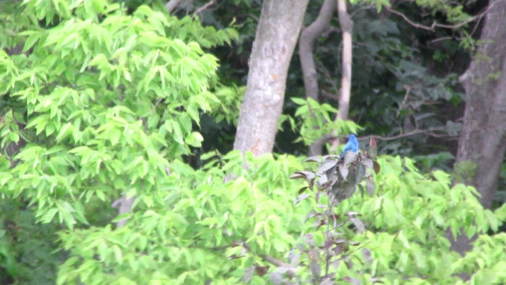 We were playing cribbage this afternoon and Sena spotted a blue bird perched on top of our crab apple tree in the back yard. I rushed to get the camera and got a quick video about 7 seconds long before it flew off. I pulled a few images of the back of the bird; it never turned around. We’re both pretty sure it’s a male indigo bunting, which Sena probably spotted about a week or so ago.