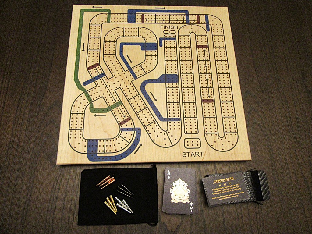 Photos of the little board and the Ebonwood board side by side shows the differences between the two. The little one seems crowded with lettering which can be hard to read and the peg holes are tiny but the directional arrows are helpful. There’s a lot more real estate on the Ebonwood board, but it could have done with a couple more directional arrows to clarify the pegging paths. The special zones are made of different colored resin inlays.