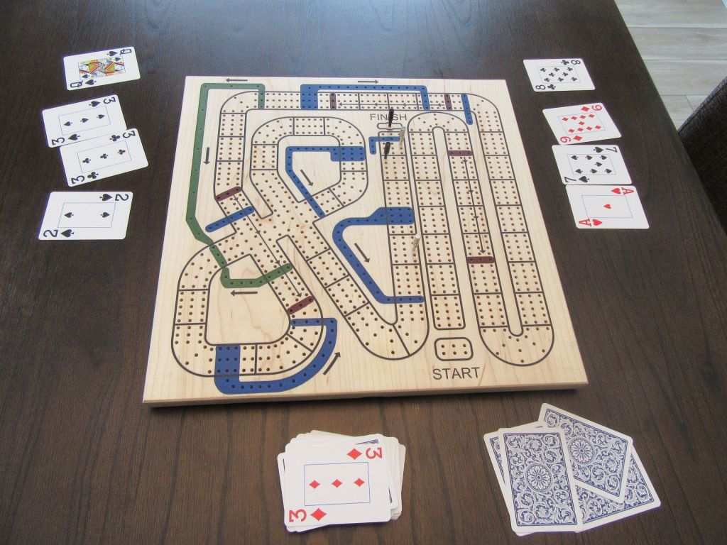 Well, we got the new Ebonwood Cribbage Wars board last night. It was delivered shortly after 8:00 p.m. We took it for a test spin this morning and our inaugural game went for well over 2 hours. By some miracle and partly because of the sadistically placed final Blue Penalty Box just outside the winning hole—I won! Sena had a comfortable lead most of the game until then. We both tripped over a couple of Blue Time Traps. Sena lucked up on the little Green Advance zone and I lucked up on landing in the first Red Skip zone.