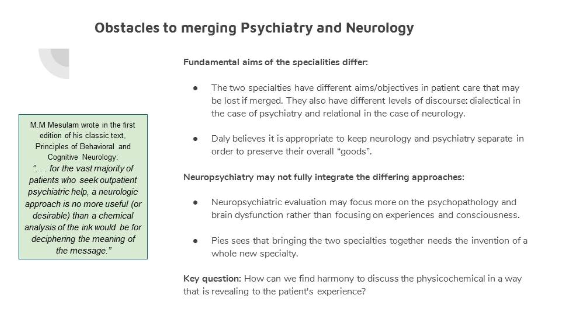 Daly, R. Pies, R. (2010). Should Psychiatry and Neurology Merge as a Single Discipline? Psychiatric Times.