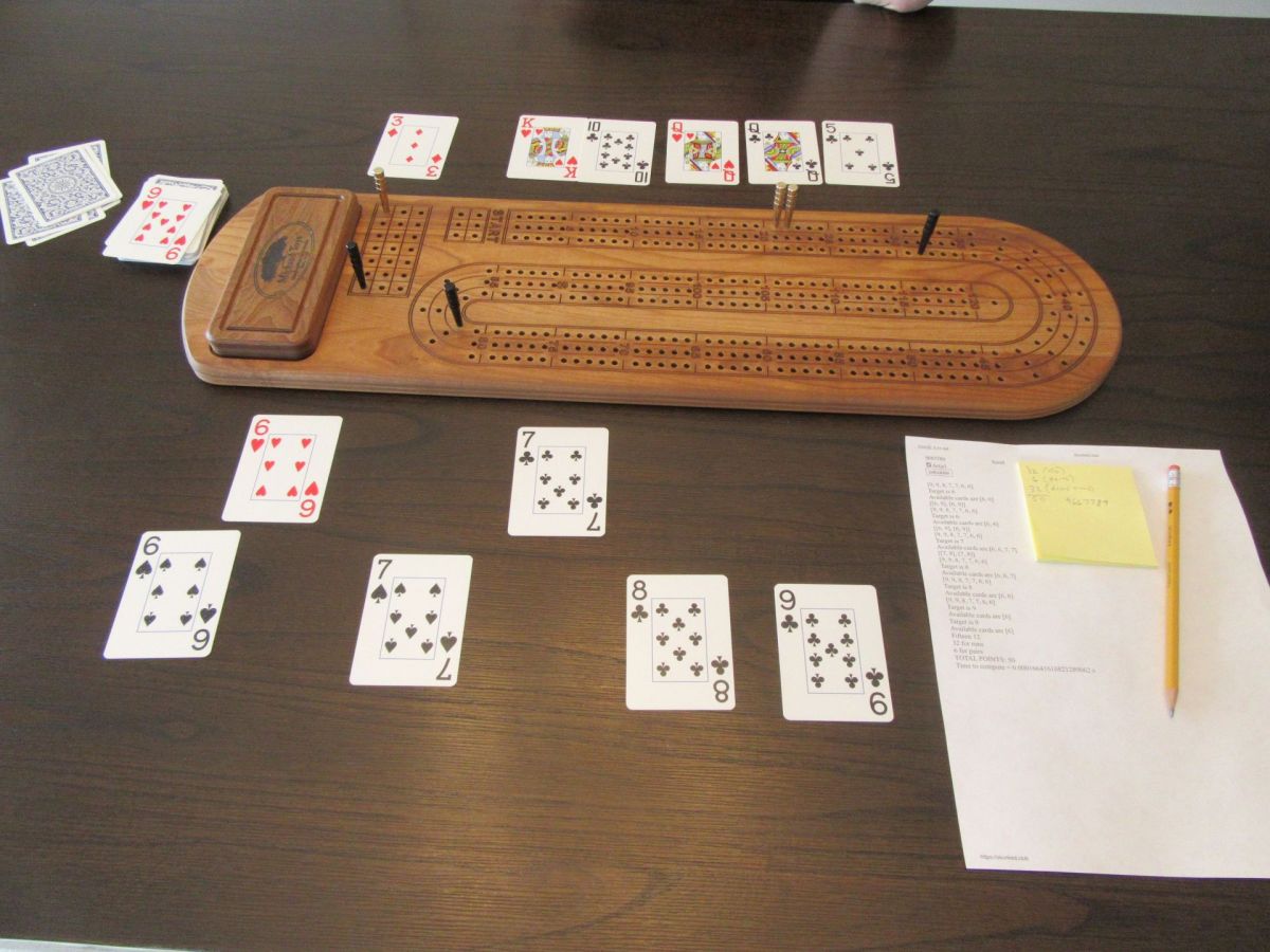 Counting the 50 points for runs was the most difficult part. There were eight different 4 card runs and spreading them out in the offset way shown in the picture made it easier to count them (32 points worth). There was 12 points for 15 for 2s and 6 points for the pairs. Adding the points for the runs, 15s, and pairs made 50. The photos compare the wide 50 point spread between my two black pegs before and after the move.