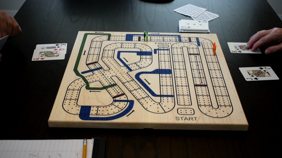 Hey, this is an announcement of our forthcoming marathon 9 card cribbage wars mashup YouTube video. We played 9 card cribbage on our Cribbage Wars board. We made liberal use of the skunked.club computer scoring program, which is why I had the laptop computer on the table.