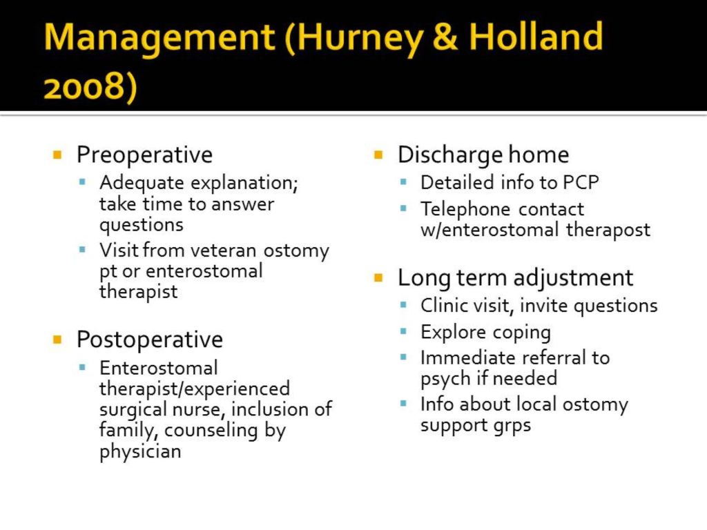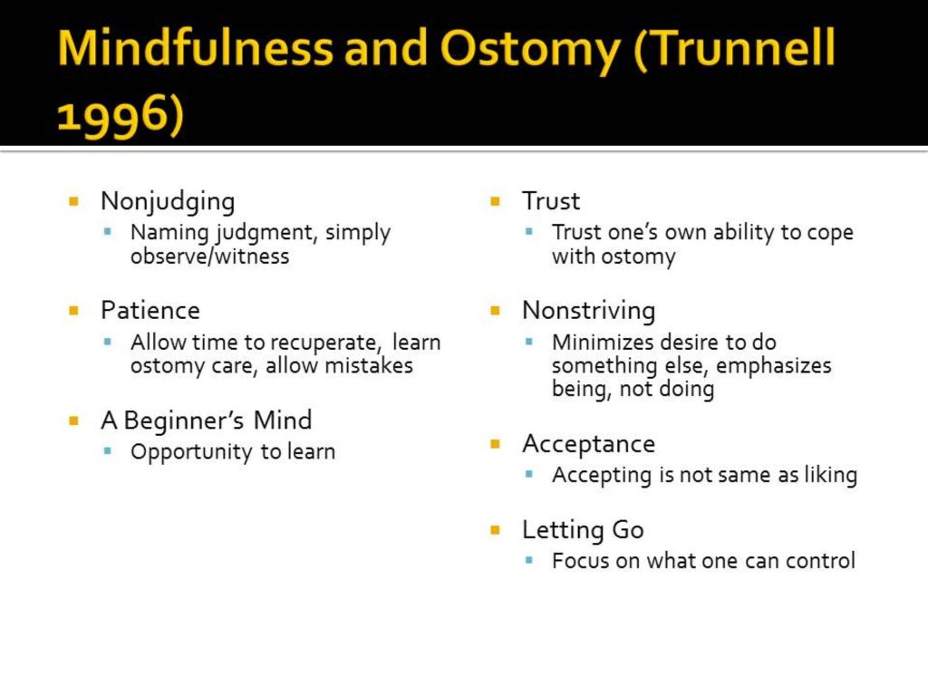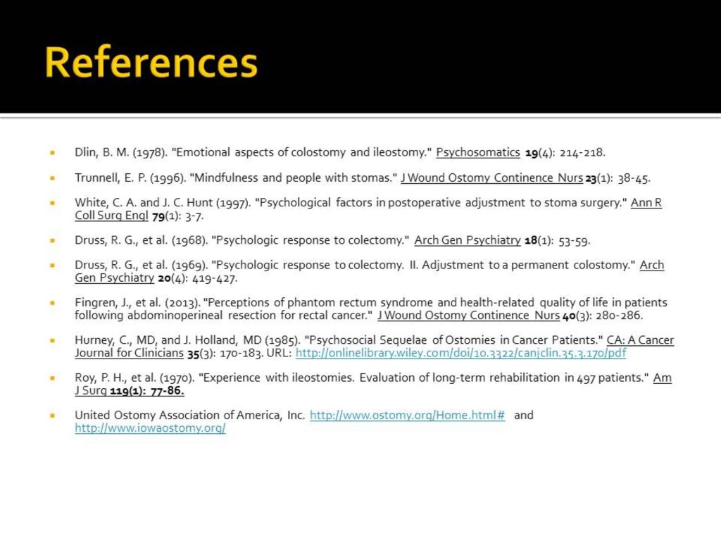 I think a fitting tribute would be to go ahead and post my CPCP on the psychosocial adjustment of patients with ostomy. One of the most interesting articles in the bibliography is how the mindfulness meditation approach to that adjustment can be very helpful. The website United Ostomy Association of America website is also informative.
