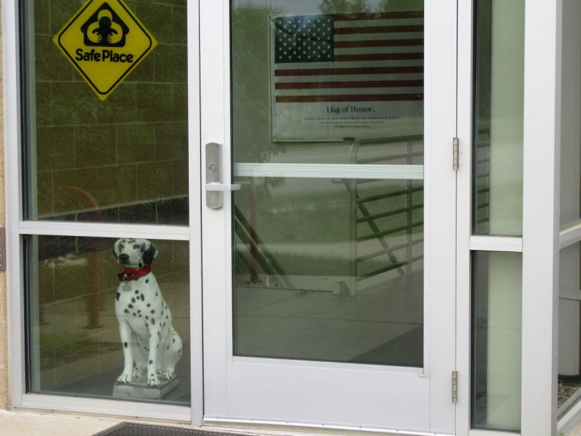 We took a walk this weekend on Scott Boulevard and eventually found our way to Fire Station No. 4. At first, we were struck by what looked like a real Dalmatian apparently sitting just inside the door. It was a pretty good sculpture. Just behind it was a large American Flag hanging on the wall. Below it was the title “Flag of Honor.”