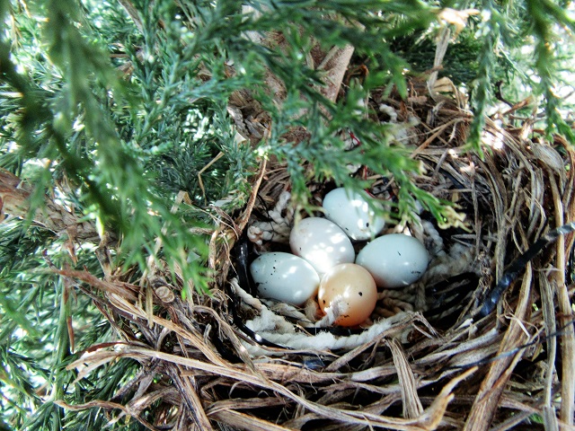 As of last Friday, the house finch had 5 white eggs in the nest, which is a typical clutch. The cardinal is probably going to end up with only two, after losing one egg somehow. Usually, the number is between 3-4.