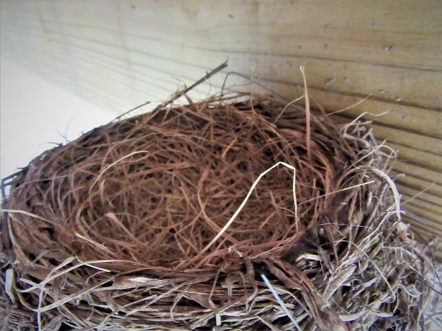 Today was Day 17 for the house finch nest with eggs-which did not hatch. I suspect the female moved on, probably because of too many intrusions. I removed the nest and eggs.