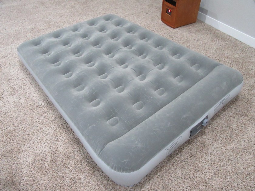 Sena came up with the idea to use air mattresses. We’ve never used them before. I had visions of me turning blue trying to blow them up. I can’t even blow up a toy balloon. Fortunately, Sena found a model that inflates just by plugging it into a regular electrical outlet and turning a knob. It doesn’t stop filling automatically, though. The instructions warn you not to inflate more than 5 minutes because that could burn out the motor. But there is no warning about the danger of an exploding air mattress. Be careful with the levitation mode.