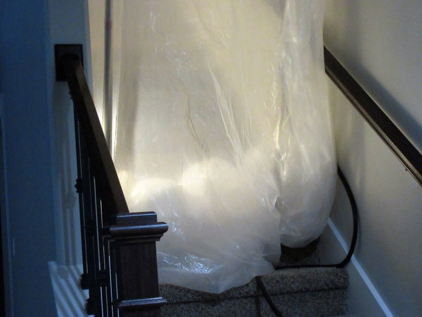 Sanding wood floors raises a regular haboob of dust, so we were sort of barricaded by heavy plastic on the stairway. We could sometimes hear the workers sneeze and cough, but most of the time they were muffled by masks. We never needed to wear masks against the dust because of the measures the workers took to protect us. We wore them when we talked face to face with them for the same reason—to protect them (and us) from coronavirus.