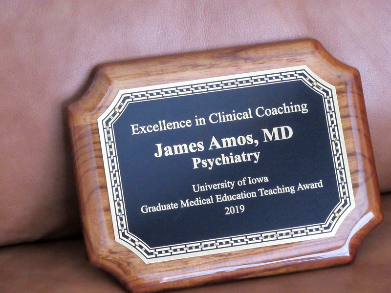 “If in Iowa’s Department of Psychiatry there is an essential example of the consultation-liaison psychiatrist, it would be Dr. James Amos. A true in-the-trenches clinician and teacher, Amos’s potential was first spotted by George Winokur and then cultivated by Winokur’s successor, Bob Robinson. Robinson initially sought a research gene in Amos, but, as Amos would be the first to state, clinical work—not research—would be Amos’s true calling. With Russell Noyes, before Noyes’ retirement in 2002, Amos ran the UIHC psychiatry consultation service and then continued on, heroically serving an 811-bed hospital. In 2010 he would edit a book with Robinson entitled Psychosomatic Medicine: An Introduction to Consultation-Liaison Psychiatry.” (Bass, J. (2019). Psychiatry at Iowa: A History of Service, Science, and Education. Iowa City, Iowa, The University of Iowa Department of Psychiatry).