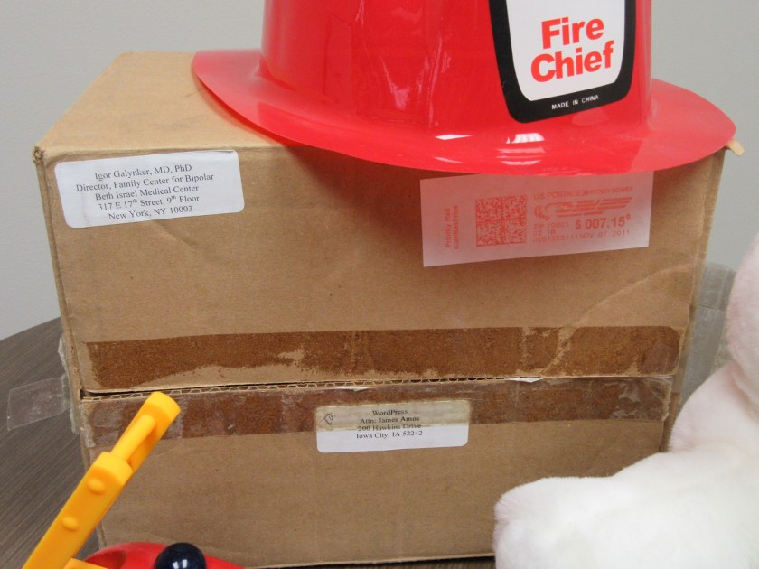 I have Bumpy the Bipolar Bear, believe or not, sent to me by psychiatrist, Dr. Igor Galynker, about whose emergency room suicide risk assessment method I had blogged about several years ago. C-L psychiatrists do a lot of suicide risk assessments in the hospital and the clinics. I still have the box with the address to me: