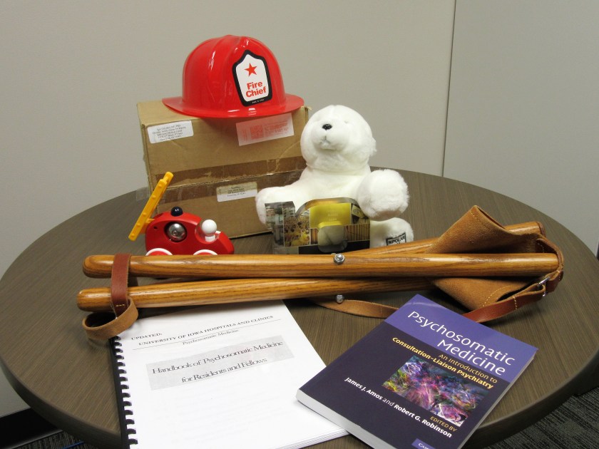 I have what seems like precious few mementos of my sojourn here in the department and, indeed, on this earth. I have a toy fireman’s helmet I found hanging in a plastic sack on my office doorknob one day. It was a gift from a Family Medicine resident who rotated on the consult service and who learned why I called it a fire brigade.
