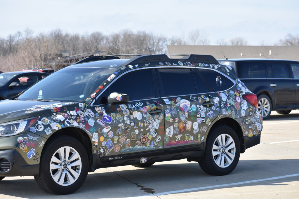 And we might have also missed the Subaru Outback with Wisconsin license plates in the parking lot. It was covered with decals. And later I discovered that the word “decal” is short for “decalcomania,” which is exactly how I would describe how the car came to be so heavily decorated—from an episode of decal-co-mania.