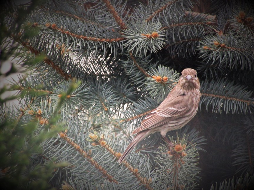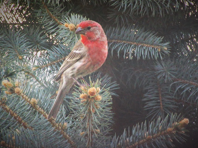 When we got home, we noticed the House Finches flitting around the juniper tree where the giant crow stole all their chicks the other day. It looks like they’re planning to rebuild. Foolhardy.