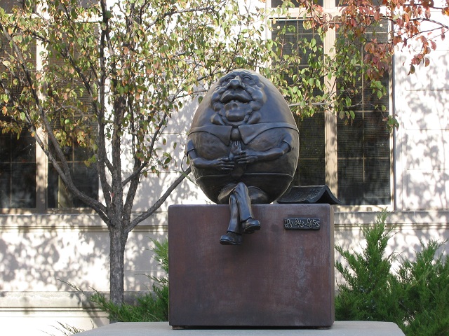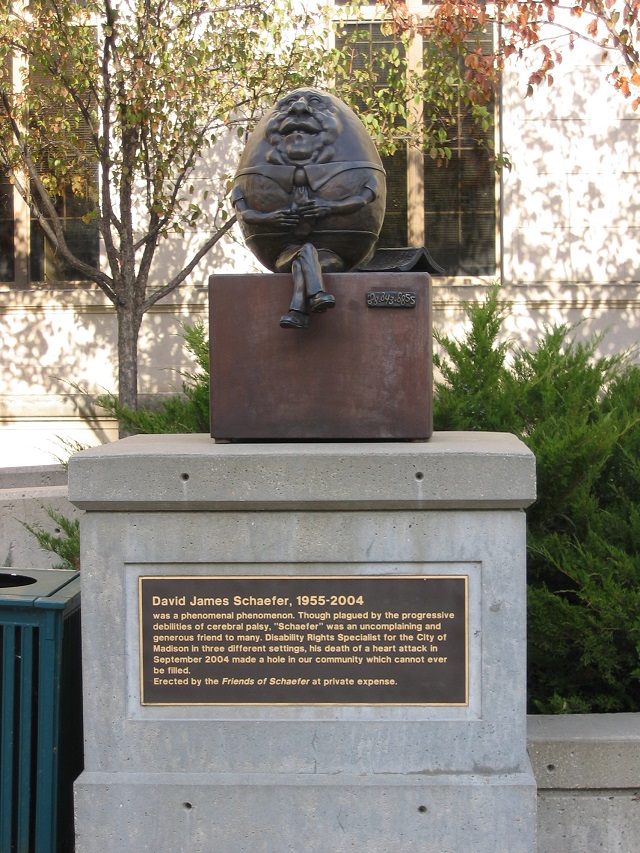 I don’t think the sculpture of Harry Dumpty is still standing in Madison, but for several years it was a distinctive bronze sculpture in front of the Madison Municipal Building just south of the intersection of Martin Luther King Jr. Boulevard and East Doty Street. I can’t see it on Google Maps nowadays.